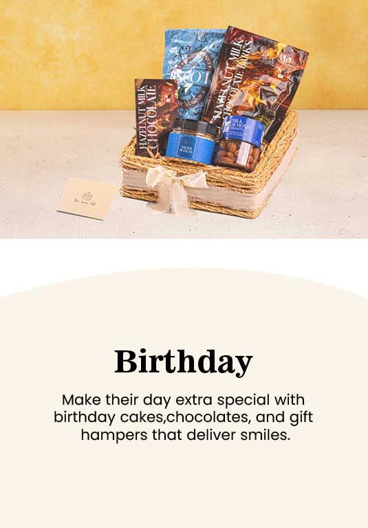 A keepsake hamper with bon bons, biscotti, almond dragees, and a milk bar — wrapped with a blue ribbon for the perfect birthday gift.- PKR 7,200