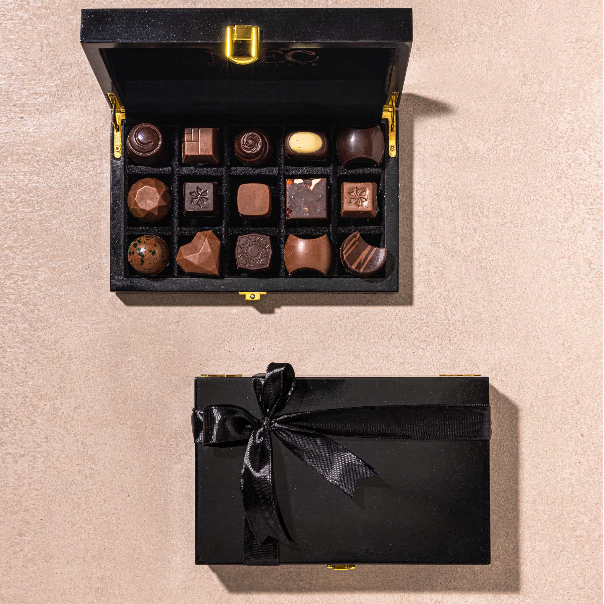 Sleek and sophisticated, this black leather suitcase box filled with 15 artisanal bon bons makes a timeless statement in elegant gifting.