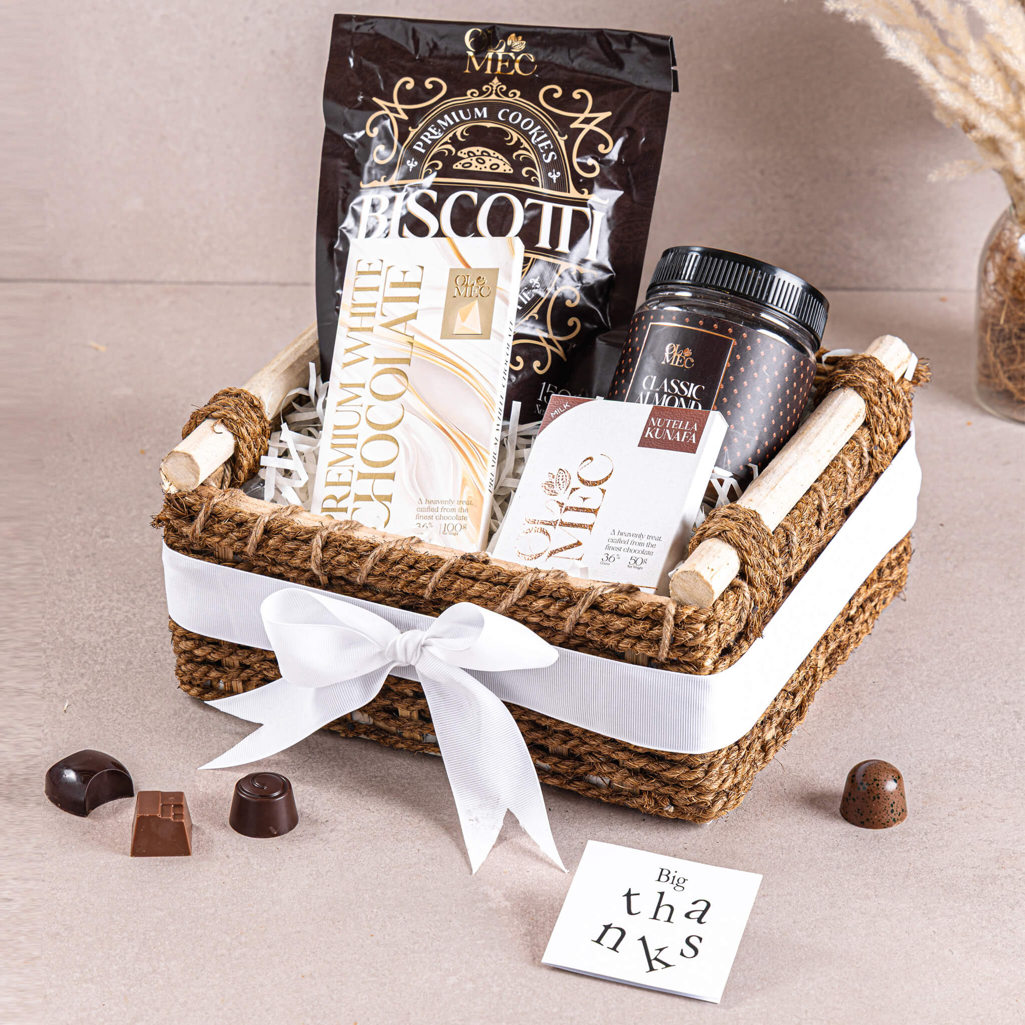 A classic chocolate basket with white and kunafa bars, biscotti, and classic almonds — rich, elegant, and irresistibly giftable.