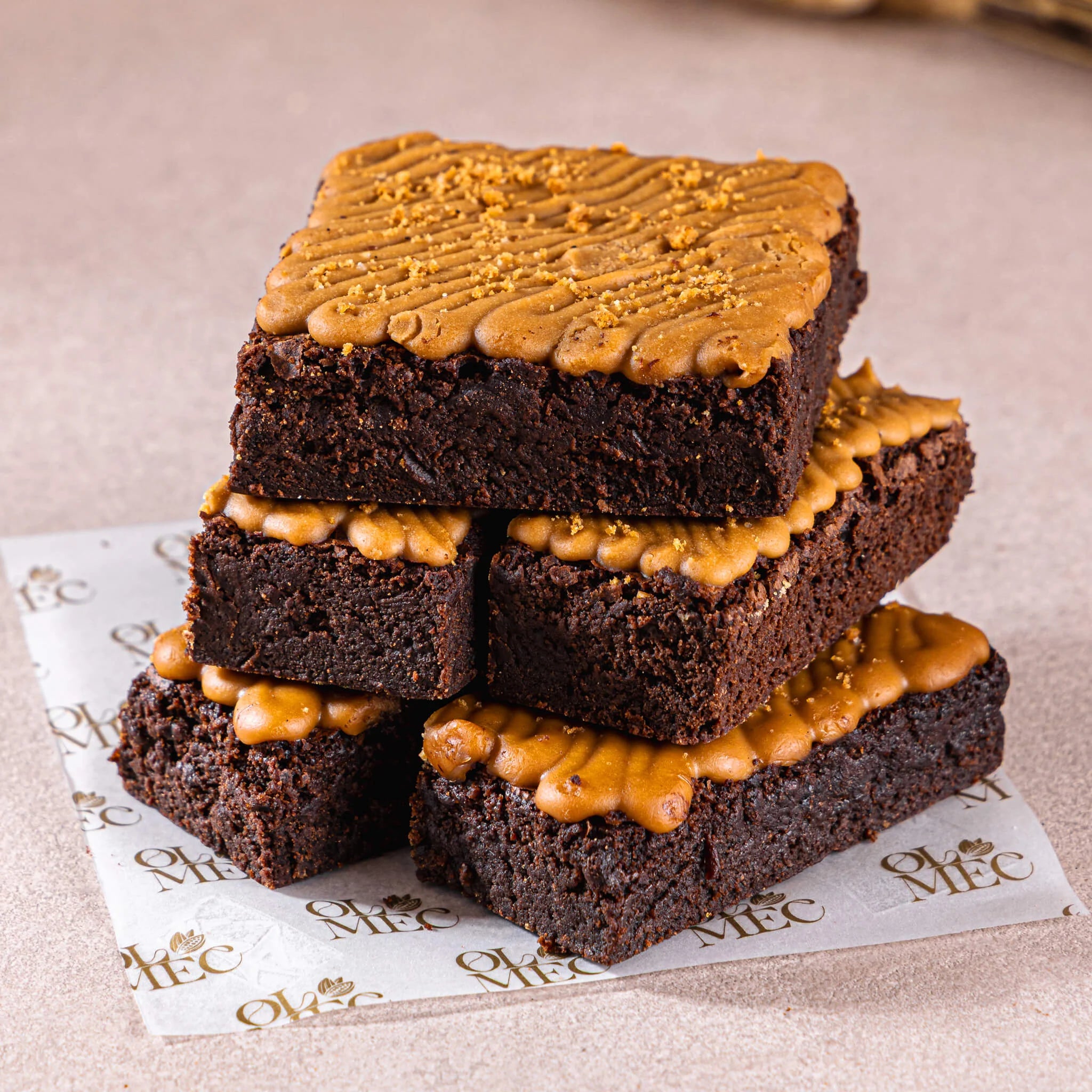 Classic brownie base topped with caramelized Lotus Biscoff spread — indulgence squared.