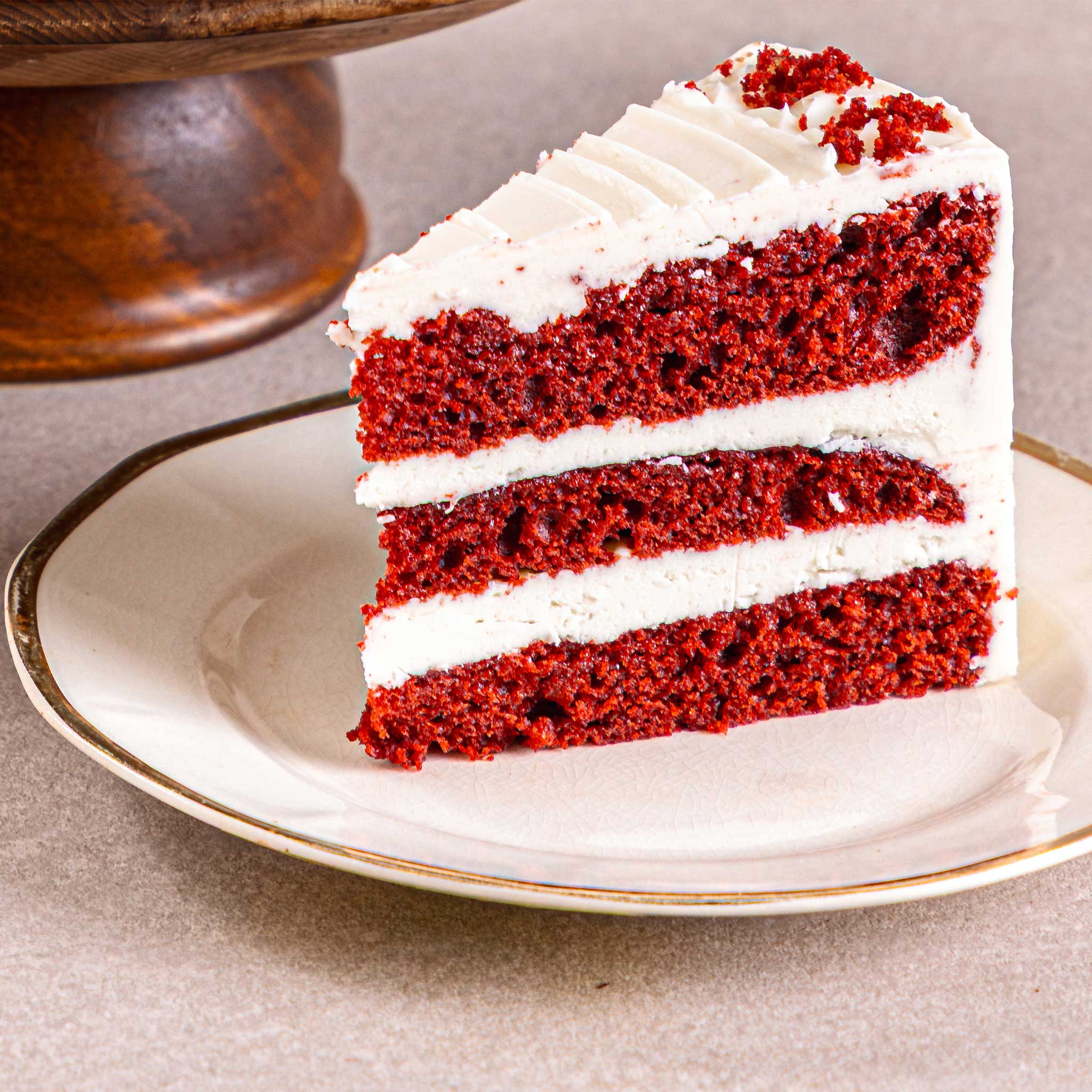 Moist red velvet sponge with a delicate hint of cocoa, layered in silky cream cheese frosting — rich, tangy-sweet, and irresistibly smooth.