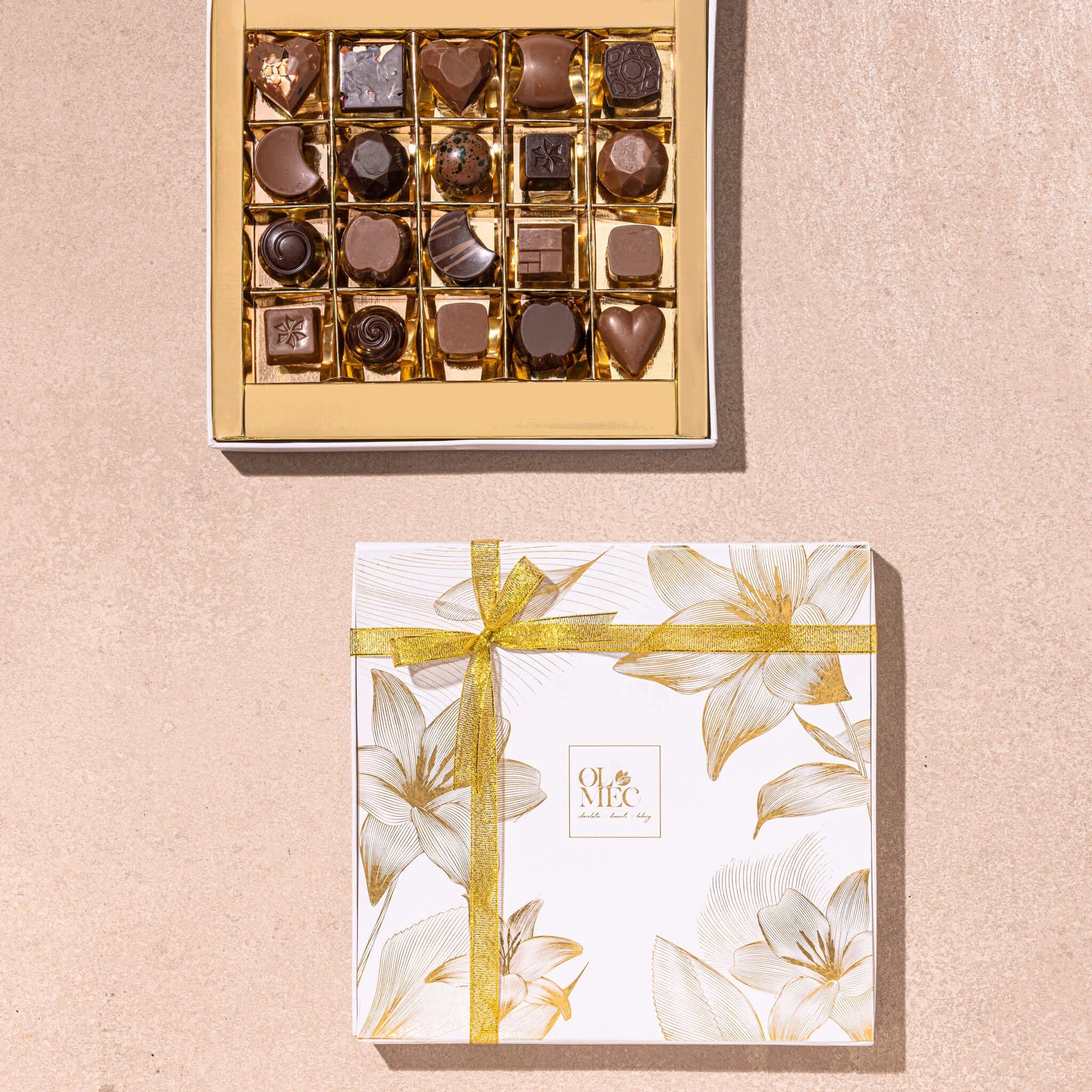 A refined, minimal box made for formal gifting — filled with elegant chocolate bon bons.